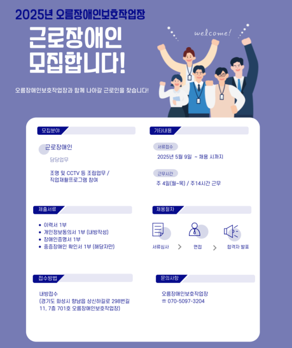 오름장애인보호작업장과 함께할 근로장애인을 모집합니다. 많은 관심 부탁드립니다!