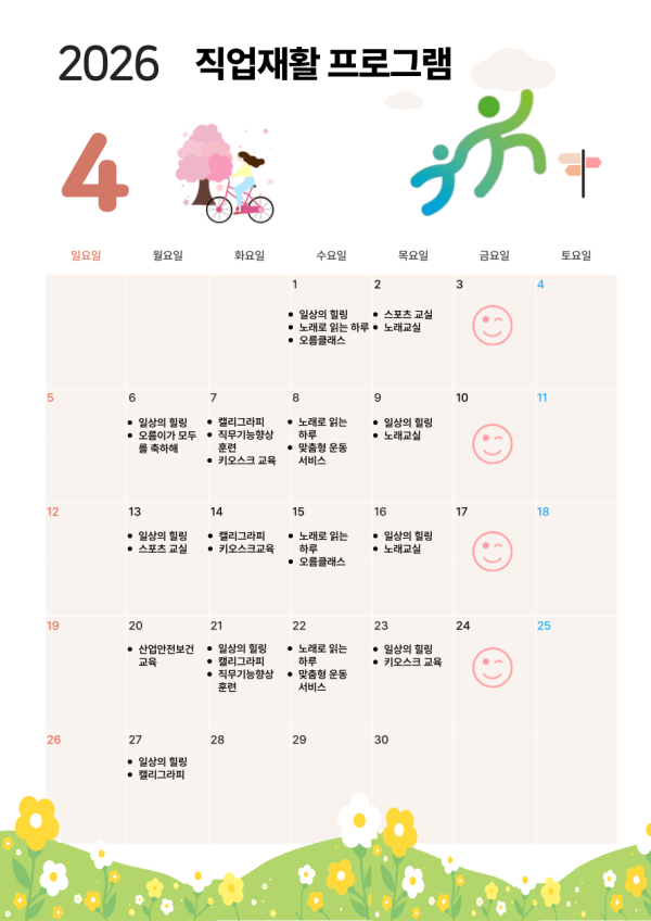 2026년 4월 직업재활프로그램 안내 페이지 정보 작성자 최고관리자 댓글 0건 조회 31회 작성일 26-03-26 16:46 목록 답변 본문 4월 프로그램 안내 다음글2026년 3월 직업재활프로그램 안내 26.02.24 댓글 0 댓글목록 등록된 댓글이 없습니다.