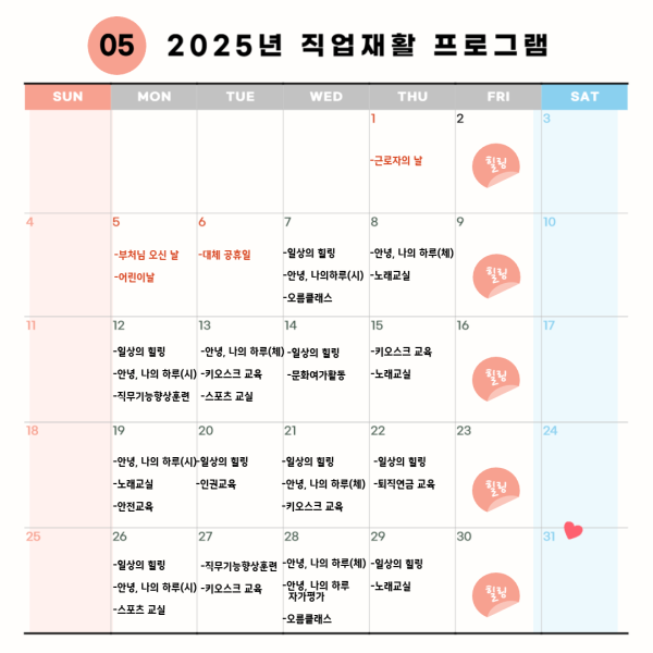 2025년 5월 직업재활 프로그램 안내 페이지 정보 작성자 최고관리자 댓글 0건 조회 53회 작성일 25-04-22 17:12 목록 답변 본문 오름 5월 프로그램 안내 이전글2025년 6월 직업재활 프로그램 안내 25.05.22 다음글2025년 4월 직업재활 프로그램 안내 25.03.21 댓글 0 댓글목록 등록된 댓글이 없습니다.