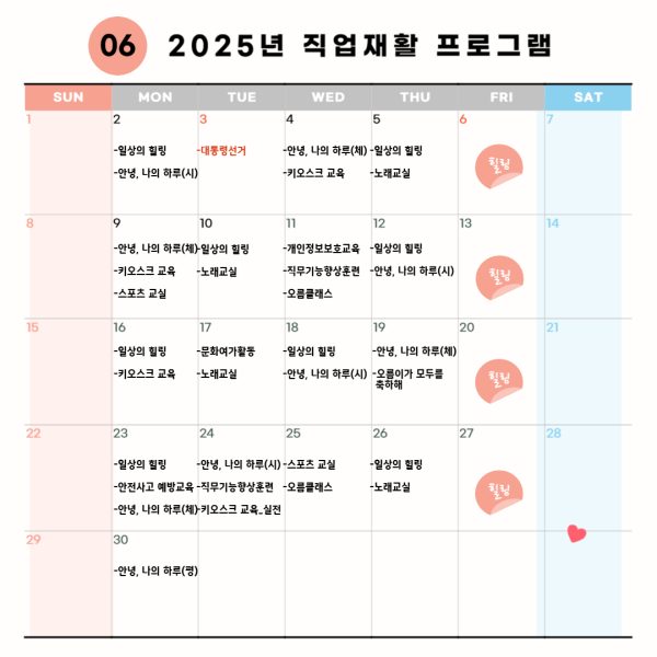 2025년 6월 직업재활 프로그램 안내 페이지 정보 작성자 최고관리자 댓글 0건 조회 68회 작성일 25-05-22 16:01 목록 답변 본문 오름 6월 프로그램 안내 이전글2025년 7월 직업재활 프로그램 안내 25.06.26 다음글2025년 5월 직업재활 프로그램 안내 25.04.22 댓글 0 댓글목록 등록된 댓글이 없습니다.