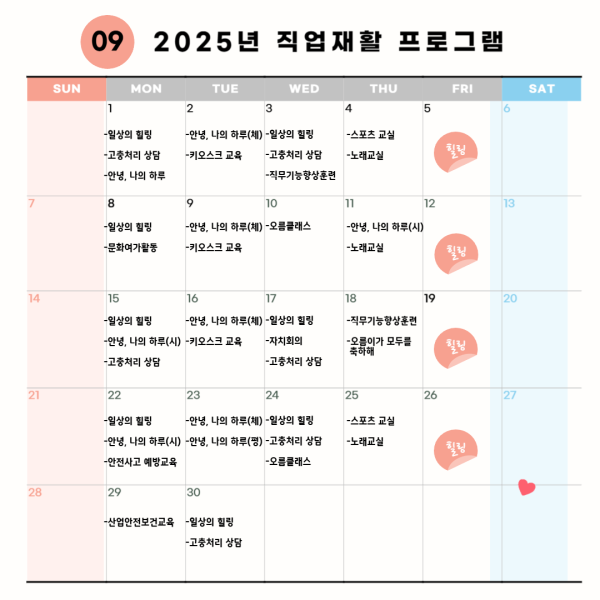2025년 9월 직업재활 프로그램 안내 페이지 정보 작성자 최고관리자 댓글 0건 조회 48회 작성일 25-08-27 08:25 목록 답변 본문 9월 직업재활 프로그램 안내 이전글2025년 10월 직업재활 프로그램 안내 25.09.25 다음글2025년 8월 직업재활 프로그램 안내 25.07.25 댓글 0 댓글목록 등록된 댓글이 없습니다.