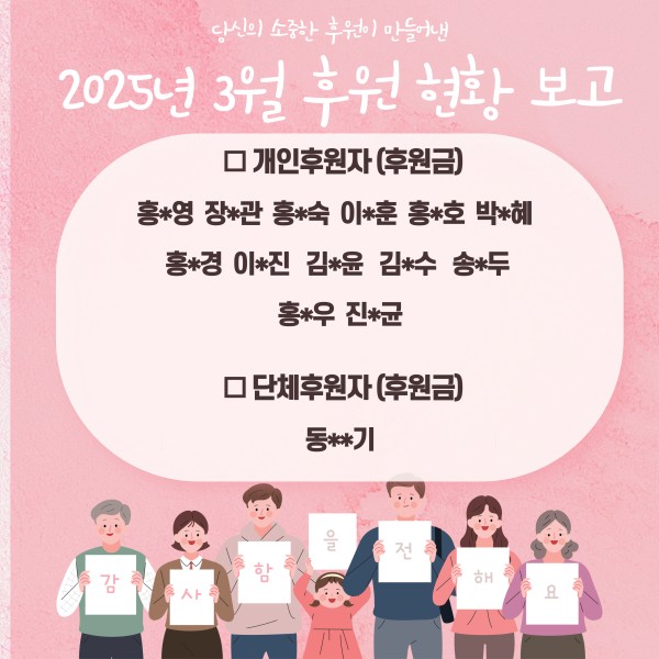 2025년 3월 후원 현황 보고 페이지 정보 작성자 최고관리자 댓글 0건 조회 70회 작성일 25-04-02 12:34 목록 답변 본문 2025년 3월 후원 현황을 보고드립니다. 감사합니다. 이전글2025년 4월 후원 현황 보고 25.05.07 다음글2025년 2월 후원현황 보고 25.03.04 댓글 0 댓글목록 등록된 댓글이 없습니다.