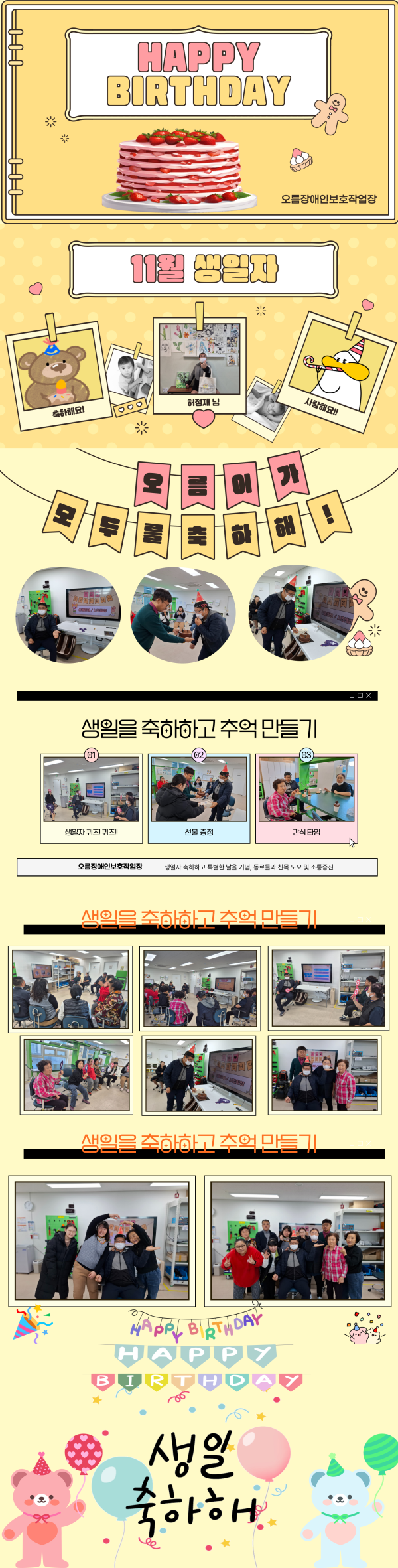 생일축하곡, 케이크 커팅, 선물 증정, 단체 사진 촬영 등