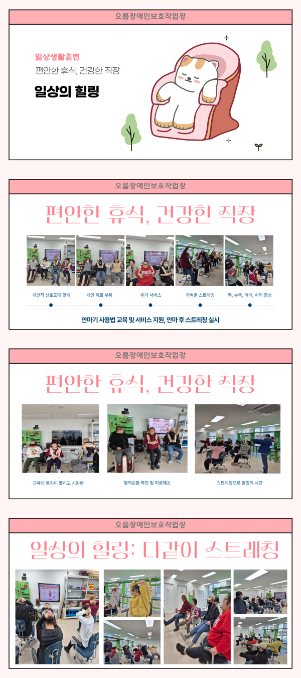 오름장애인보호작업장에서는 근로인들의 신체적·정신적 피로와 스트레스를 효과적으로 완화하고,
