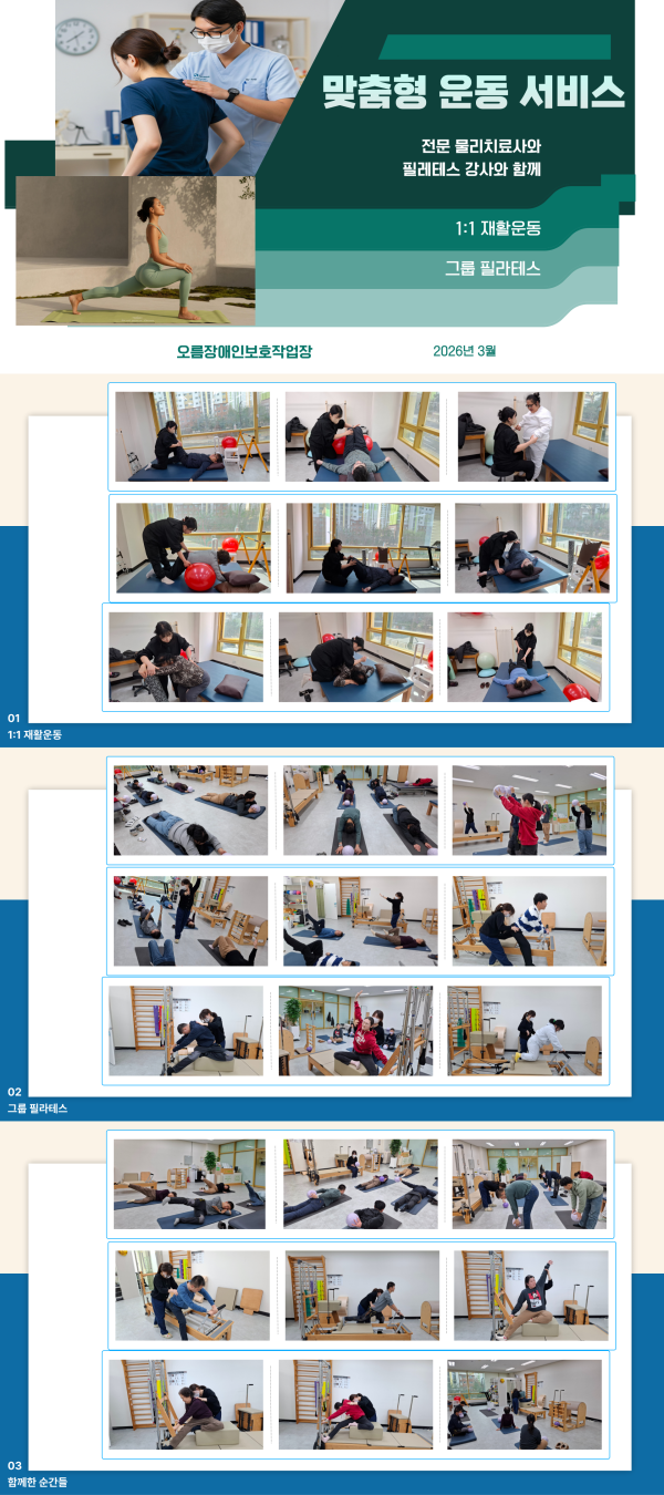2026년 3월 맞춤형 운동 서비스 페이지 정보 작성자 최고관리자 댓글 0건 조회 15회 작성일 26-04-01 20:49 목록 답변 본문 3월 맞춤형 운동 서비스 이전글2026년 3월 오름클래스 26.04.01 다음글2026년 3월 캘리그라피 26.04.01 댓글 0 댓글목록 등록된 댓글이 없습니다.