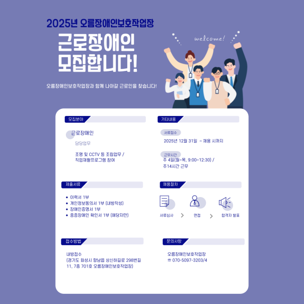 오름장애인보호작업장과 함께할 근로장애인을 모집합니다. 많은 관심 부탁드립니다:)