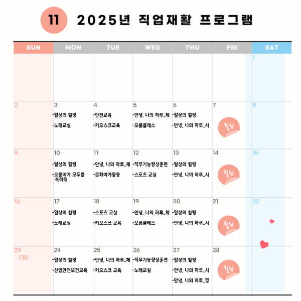2025년 11월 직업재활 프로그램 안내 페이지 정보 작성자 최고관리자 댓글 0건 조회 1회 작성일 25-10-21 18:34 목록 답변 본문 11월 직업재활 프로그램 안내 다음글2025년 10월 직업재활 프로그램 안내 25.09.25 댓글 0 댓글목록 등록된 댓글이 없습니다.