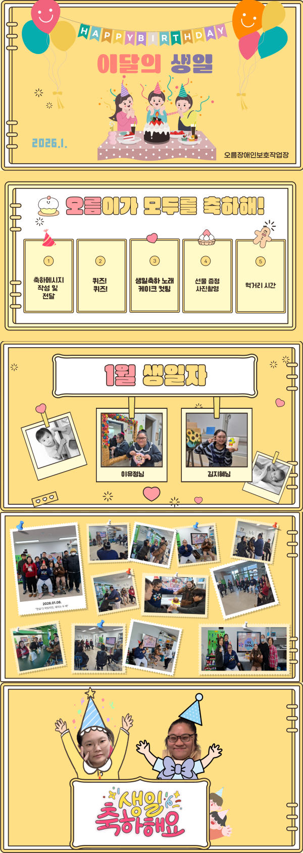 2026년 1월 오름이가 모두를 축하해 페이지 정보 작성자 최고관리자 댓글 0건 조회 4회 작성일 26-02-06 10:34 목록 답변 본문 1월 생일잔치 이전글2026년 1월 캘리그라피 26.02.06 다음글2026년 1월 노래로 읽는 하루 26.02.05 댓글 0 댓글목록 등록된 댓글이 없습니다.